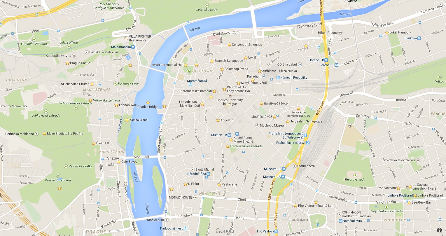 This is my Prague map (click to zoom – sorry it’s not easier to read!). It includes gardens, museums, palaces, restaurants, churches, and other places to visit. To plan a day I’d pick a group of these that are fairly close together – say, all the ones on the west side of the river (for reference, walking from Prague Castle to Cafe Savoy should take only about 20 minutes). I really like the idea of walking from one end of a neighborhood to the other and taking in sights along the way, so that’s partially how I’m scheduling this trip. We’re going to be in Prague for five days, so we can be a bit more leisurely and also have some time each day for just general wandering and taking in unanticipated sights. We’ll also have time to return to some of the neighborhoods if we want to.